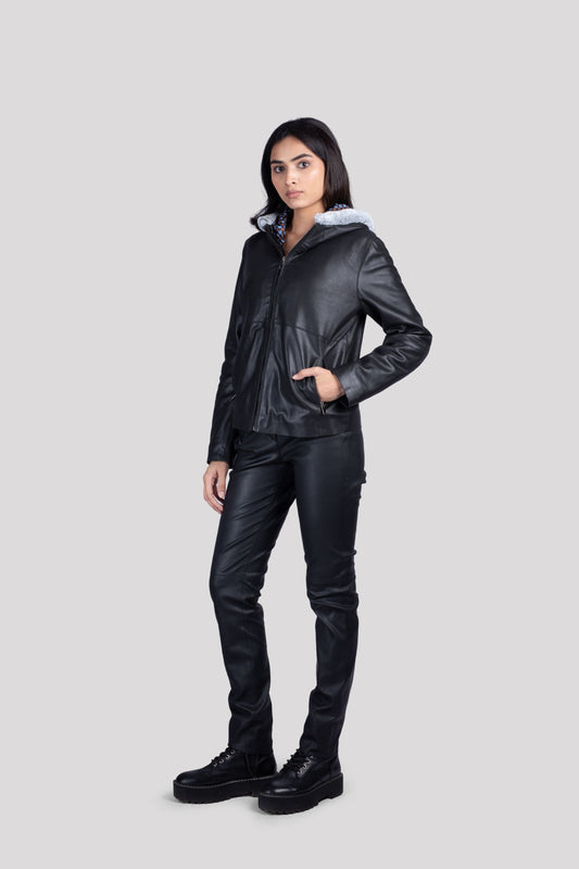 LADIES LEATHER JACKET WITH HOOD / FAKE FUR