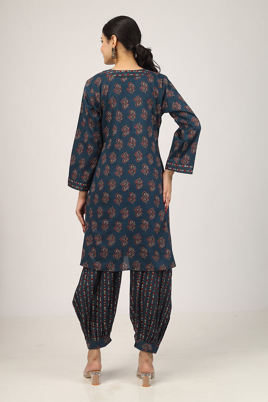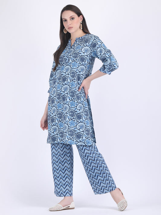 COTTON SANGANERI PRINT COMFORT WEAR SET IN INDIGO BLUE