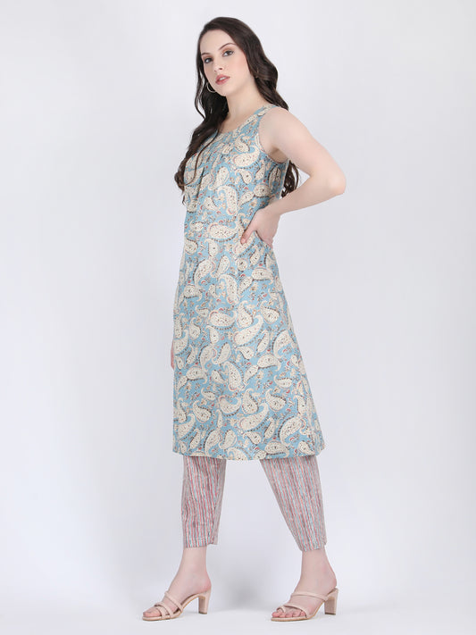 COTTON PAISLEY PRINT BOX PLEATS KURTA WITH PENCIL PANTS BLUE