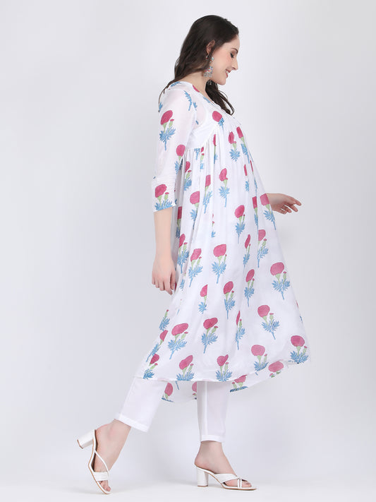 MUSLIN VISCOSE FLARED LONG SHIRT IN WHITE WITH PINK FLORAL MOTIFS