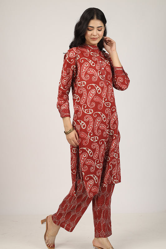100% Cotton Floral Pattern Kurta Pyjama Set Red