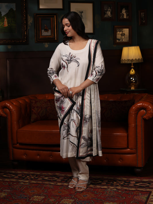 KURTA SET FEATURING HAND-EMBROIDERED FRONT, SLEEVES, AND DUPATTA-WHITE