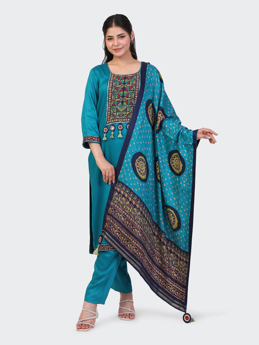 KURTA SET FEATURING HAND-EMBROIDERED FRONT, SLEEVES, DUPATTA WITH TASSELS-TURQUOISE