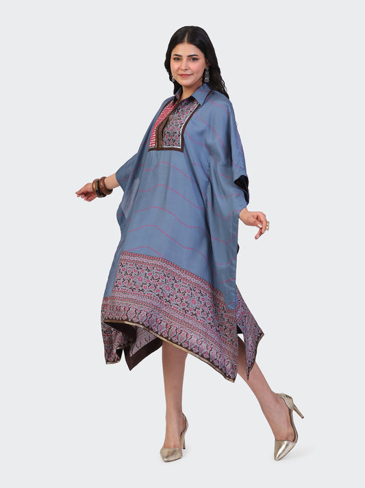 KAFTAN DRESS FEATURING MIRROR WORK EMBROIDERED FRONT-TURQUOISE