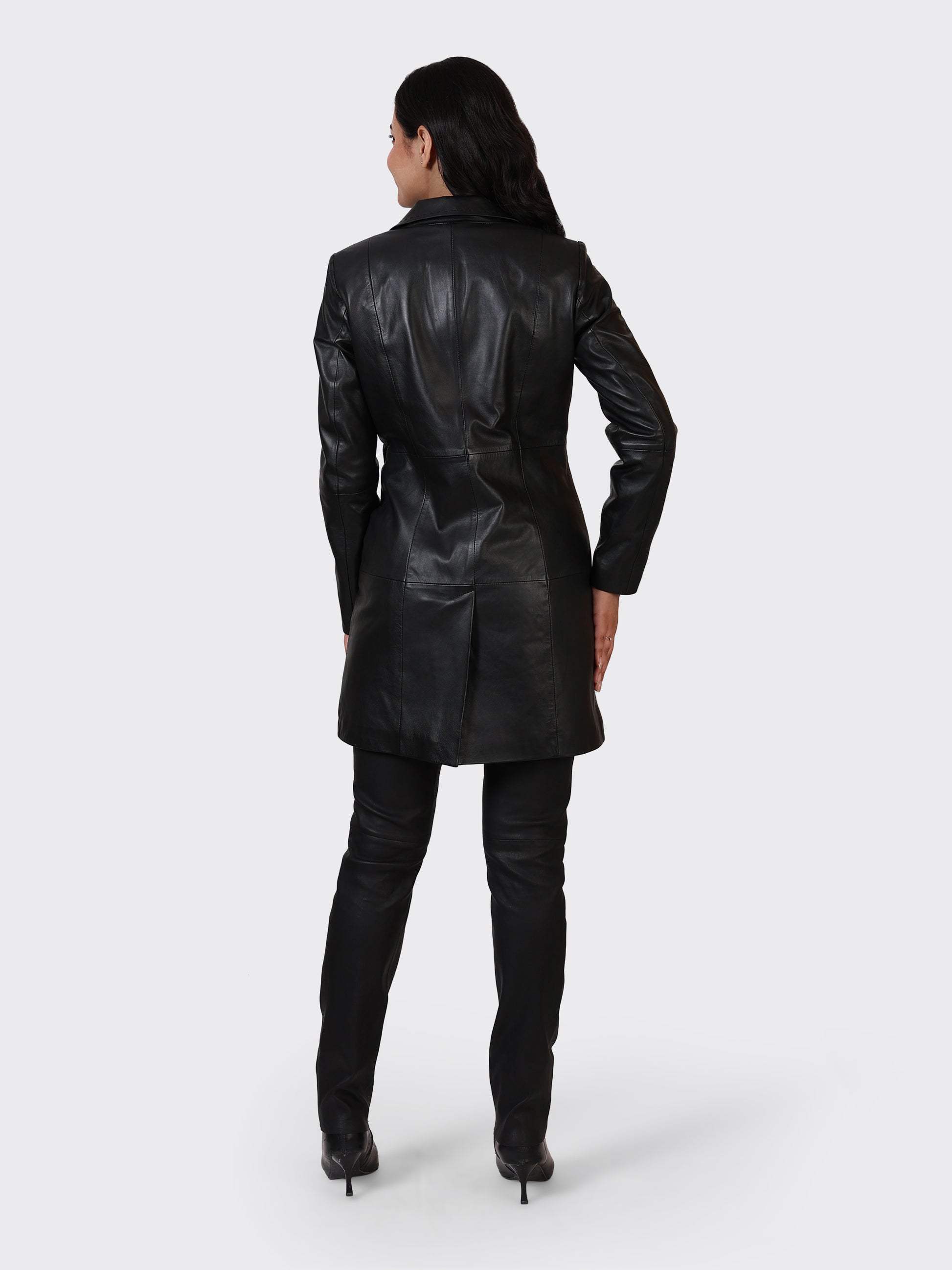 A chic and versatile ladies' knee-length leather jacket crafted from 100% genuine lamb leather. Designed for winter wear, this jacket provides warmth, coverage, and timeless elegance. It features two practical side pockets and is finished with a smooth polyester lining, ensuring comfort and durability for everyday use or evening outings.