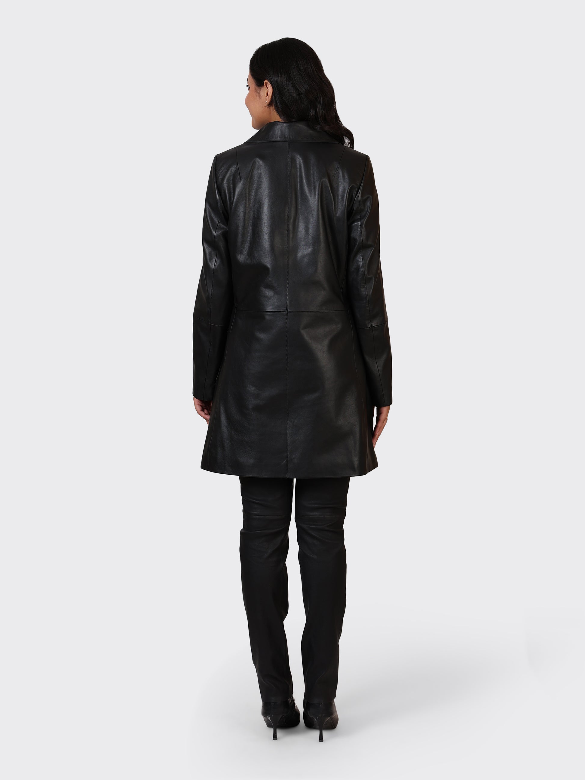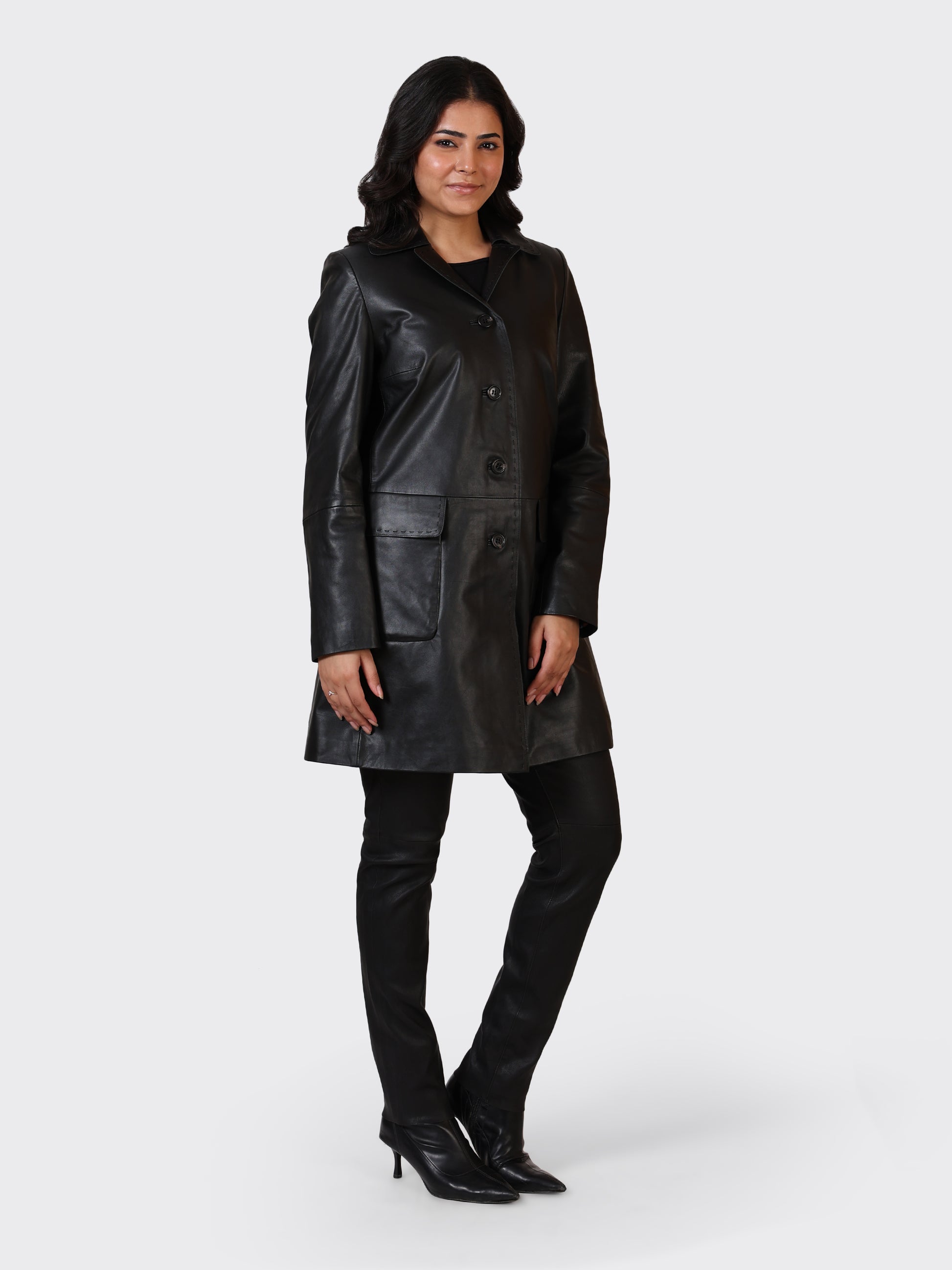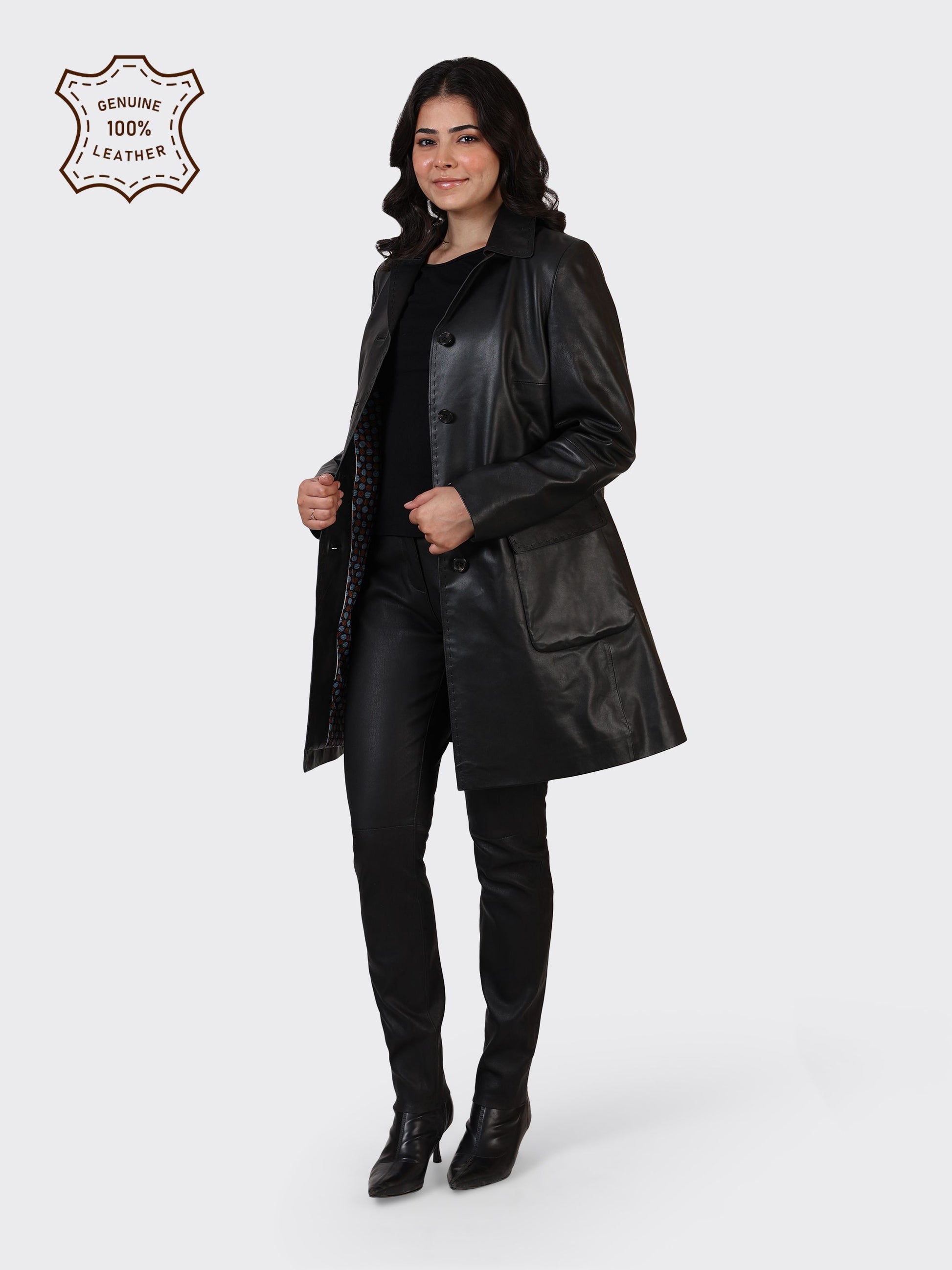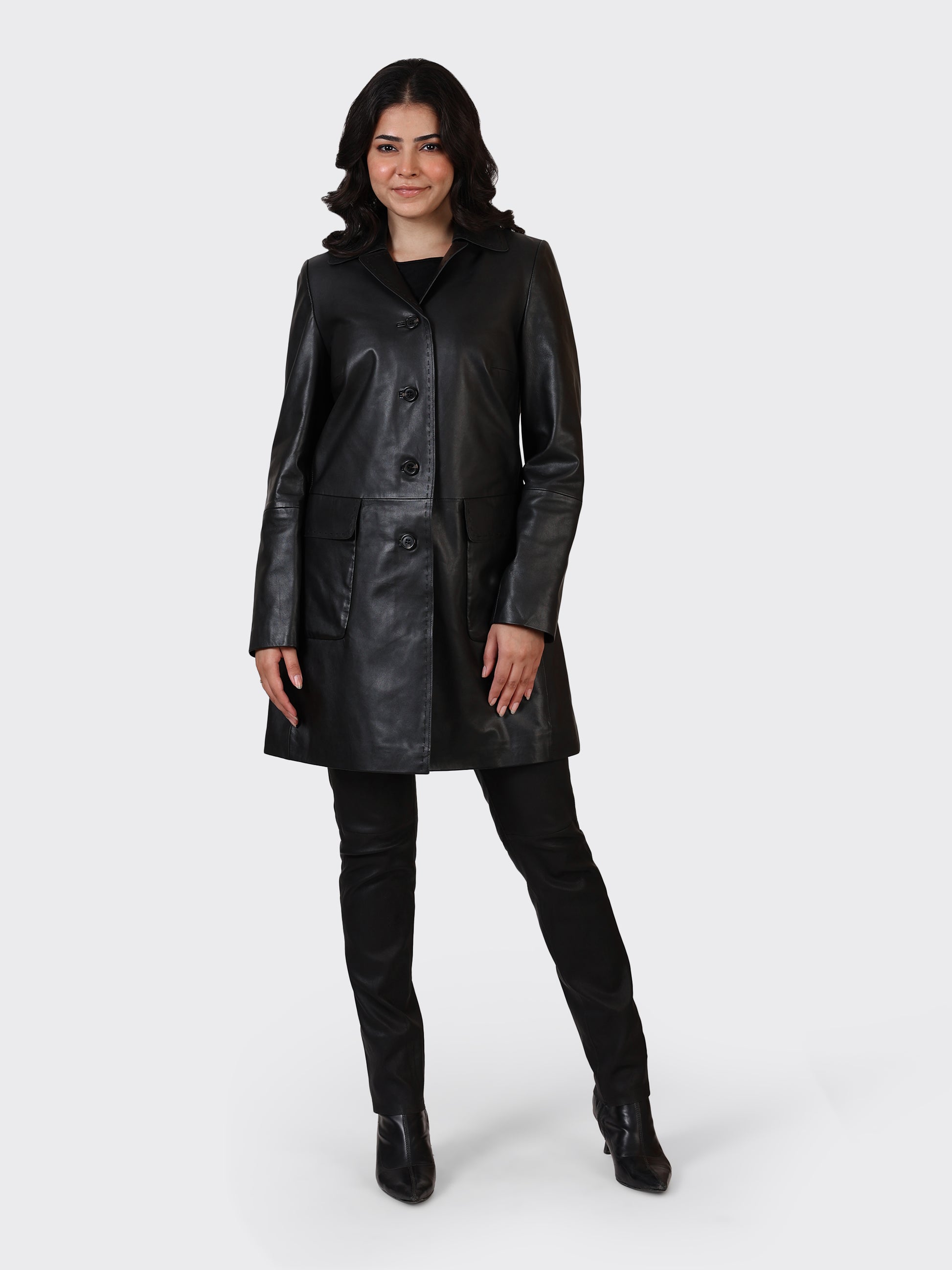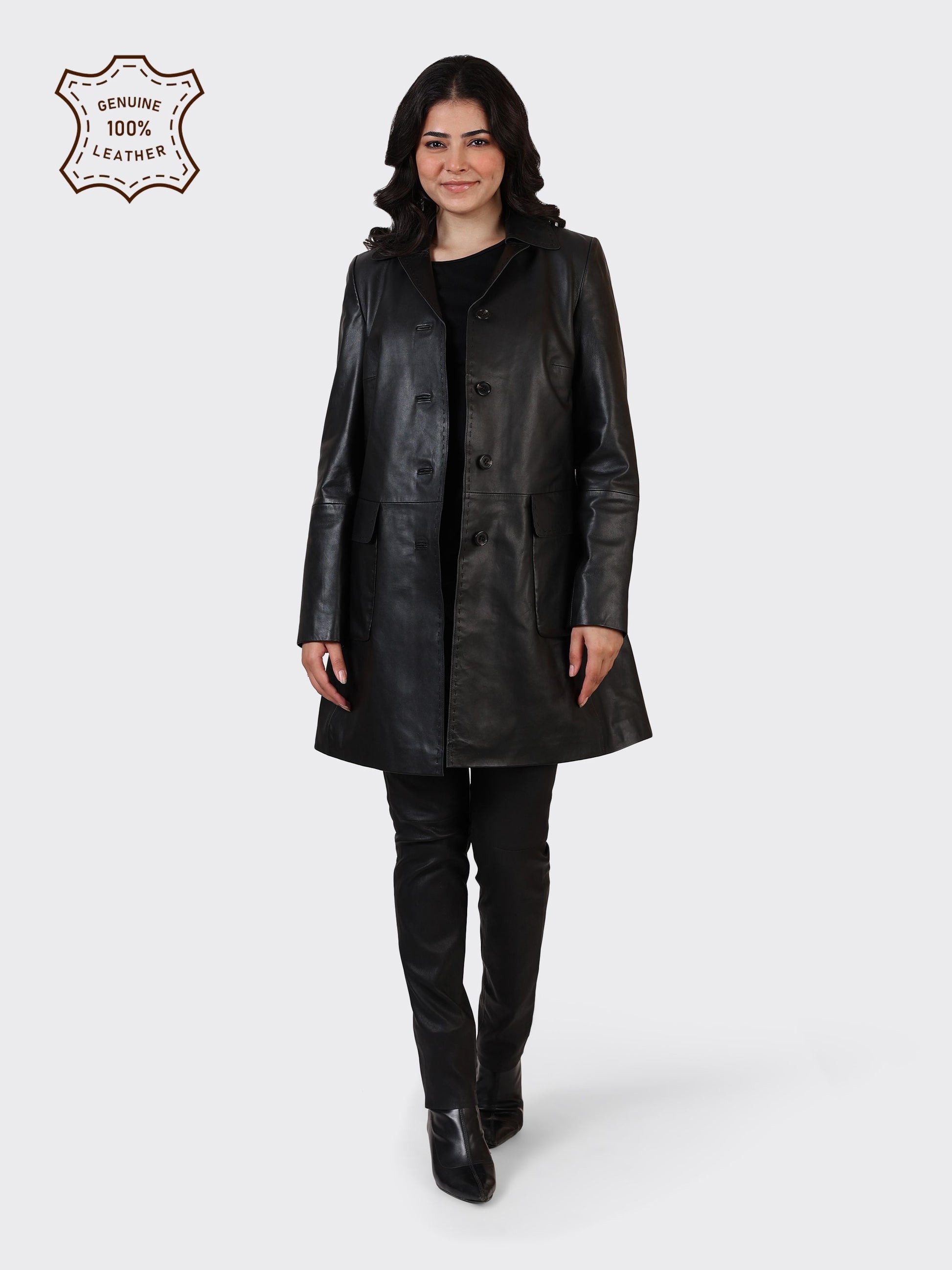 A sophisticated and versatile ladies' knee-length leather jacket crafted from 100% genuine lamb leather. Designed for winter wear, this jacket combines warmth, coverage, and timeless elegance. It includes two practical side pockets and is lined with smooth polyester, ensuring comfort and durability for everyday use or evening outings.
