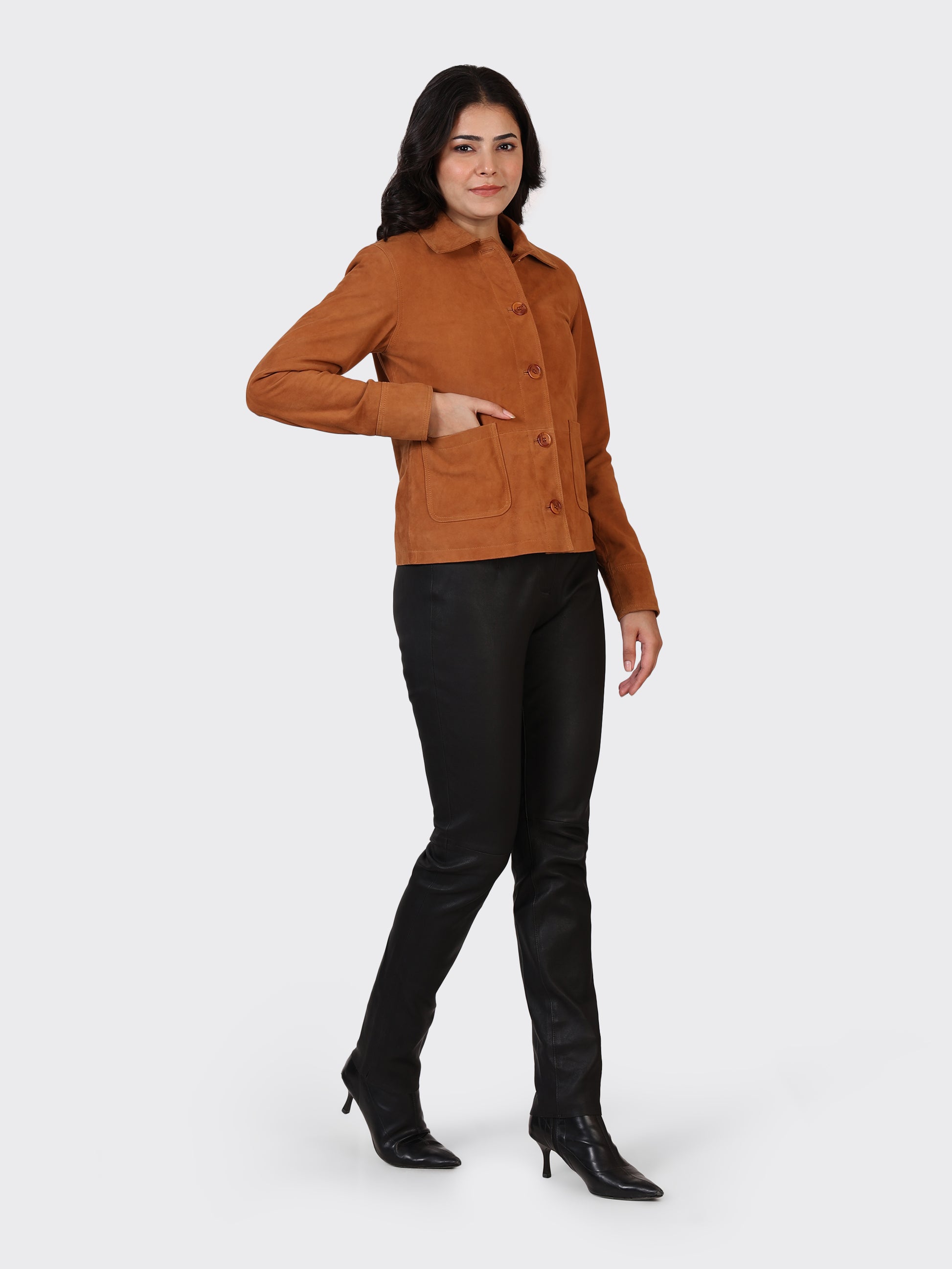 A stylish ladies’ short leather jacket in a warm cognac shade, crafted from 100% genuine goat leather. Designed for winter, this jacket offers durability and sophistication, finished with a polyester lining for comfort. Best maintained with specialized leather dry cleaning.