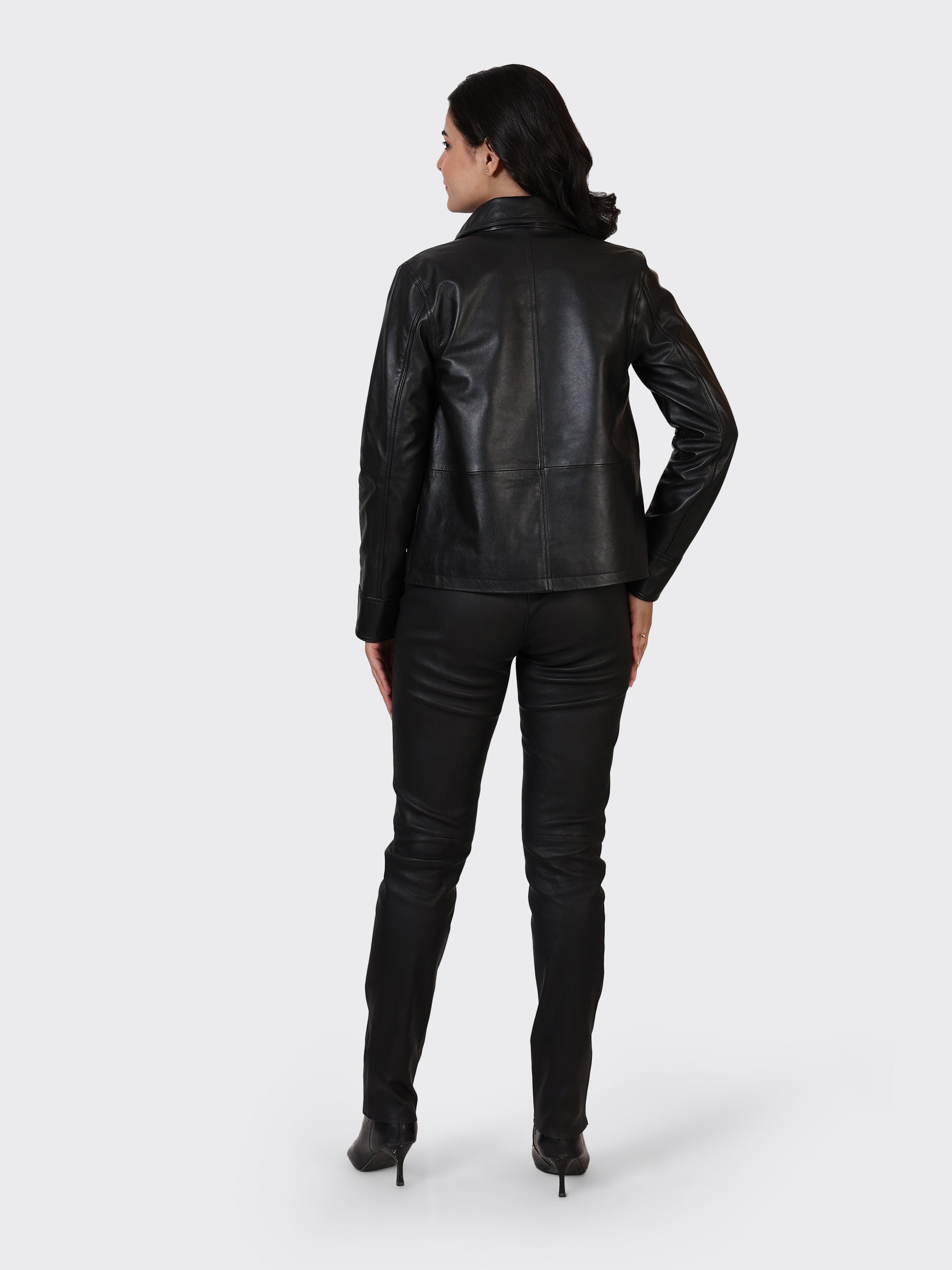 A stylish and versatile ladies' short leather jacket crafted from 100% genuine lamb leather. Designed for winter wear, this jacket offers warmth and timeless elegance. It features two practical side pockets and is finished with a smooth polyester lining, ensuring comfort and durability for everyday use or evening outings.