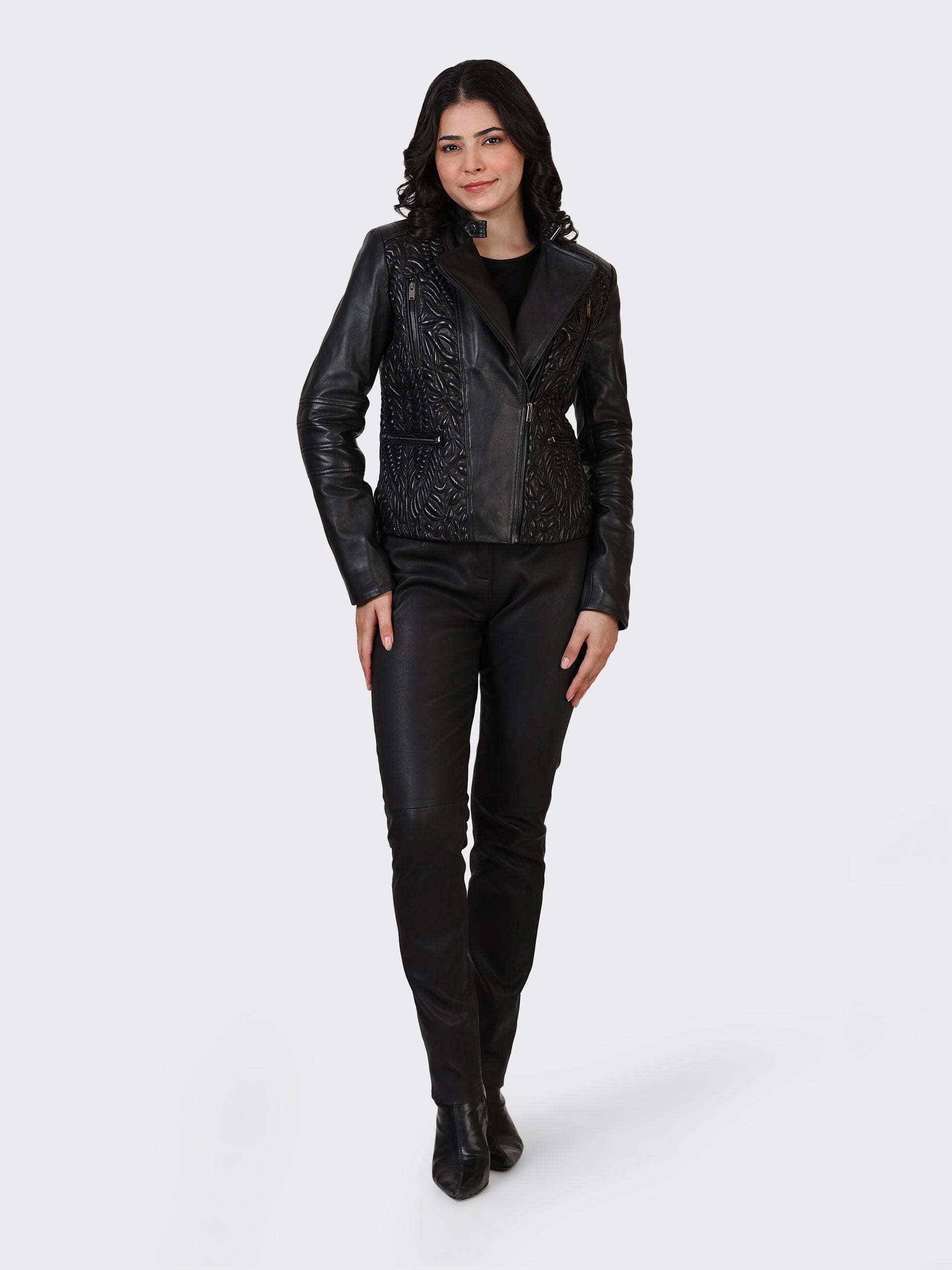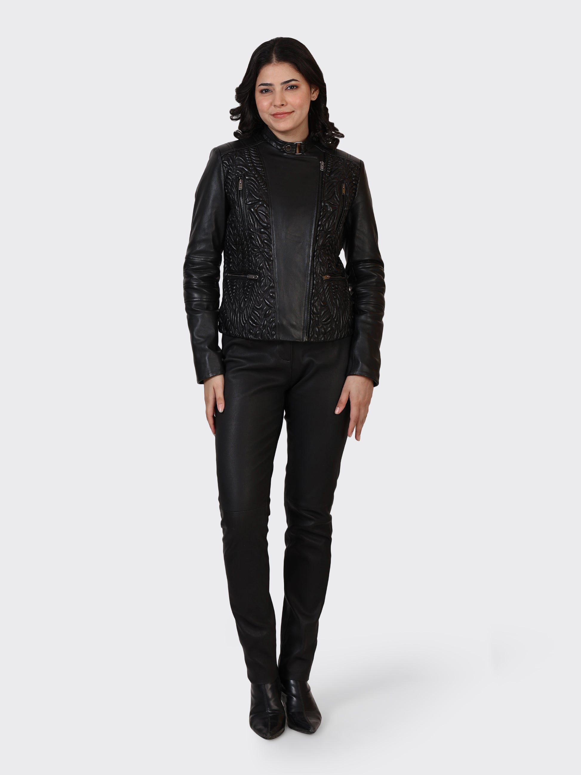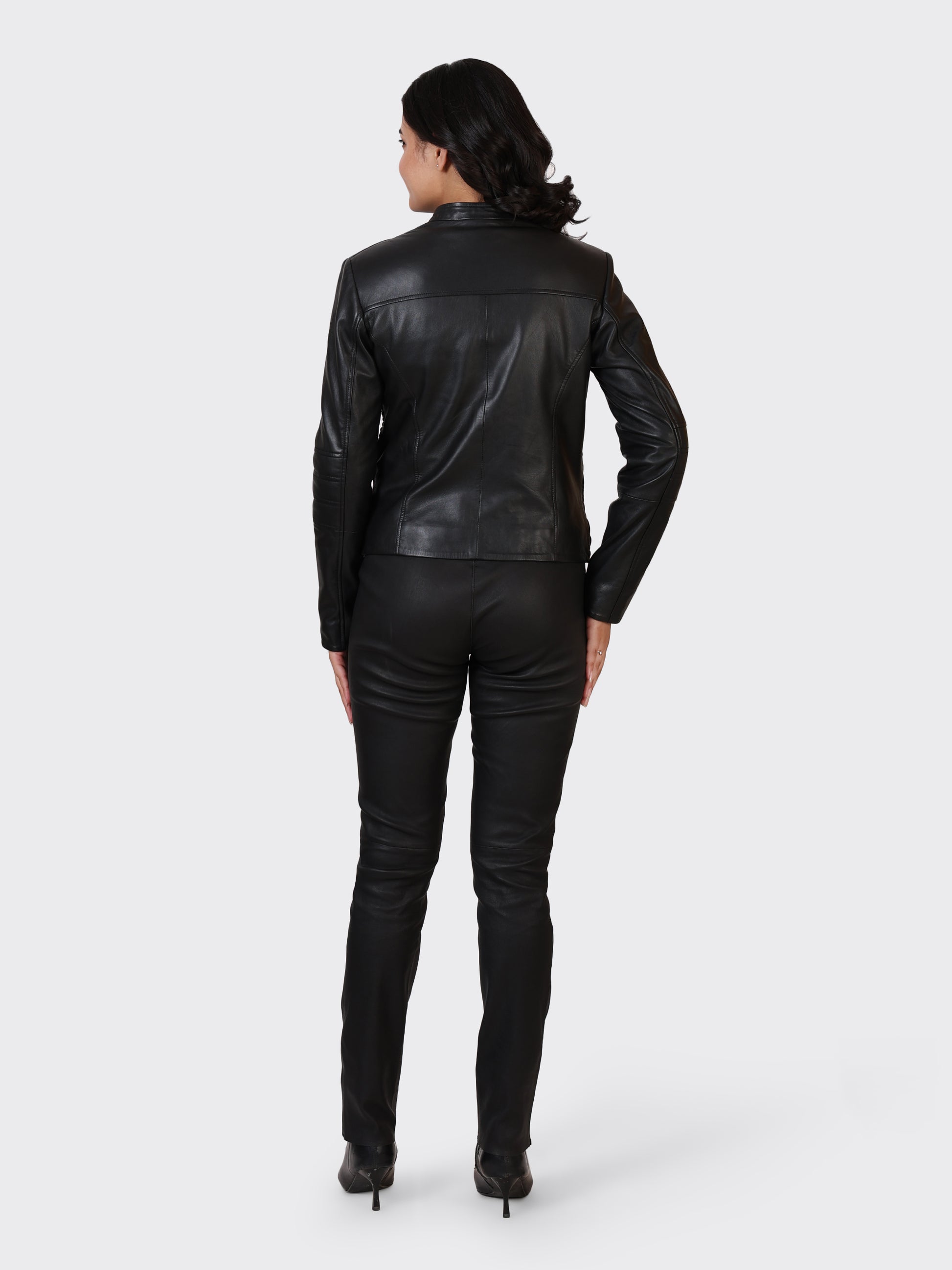 A stylish and versatile ladies' short leather jacket crafted from 100% genuine lamb leather. Designed for winter wear, this jacket offers warmth and timeless elegance. It features two practical side pockets and is finished with a smooth polyester lining, ensuring comfort and durability for everyday use or evening outings.