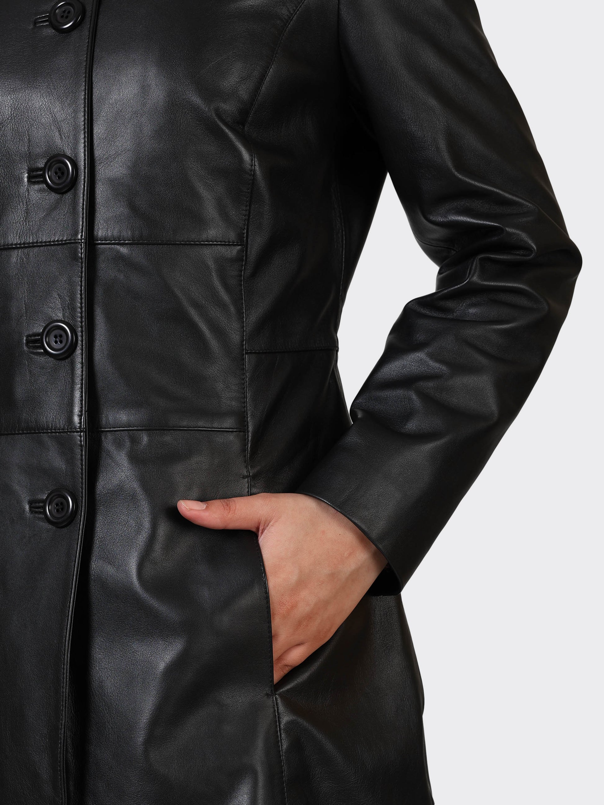 A chic and versatile ladies' knee-length leather jacket crafted from 100% genuine lamb leather. Designed for winter wear, this jacket provides warmth, coverage, and timeless elegance. It features two practical side pockets and is finished with a smooth polyester lining, ensuring comfort and durability for everyday use or evening outings.
