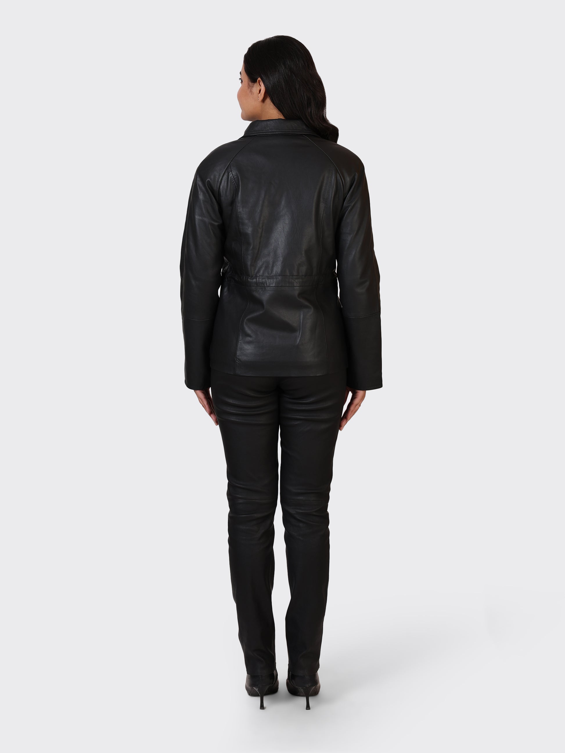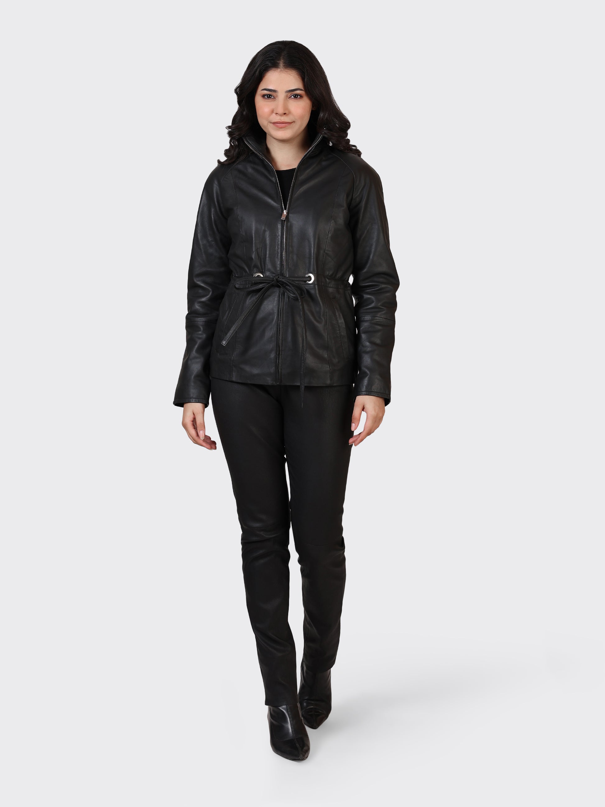 A chic and versatile ladies' short-length leather jacket crafted from 100% genuine lamb leather. Designed for winter wear, this jacket provides warmth, coverage, and timeless elegance. It features two practical side pockets and is finished with a smooth polyester lining, ensuring comfort and durability for everyday use or evening outings.