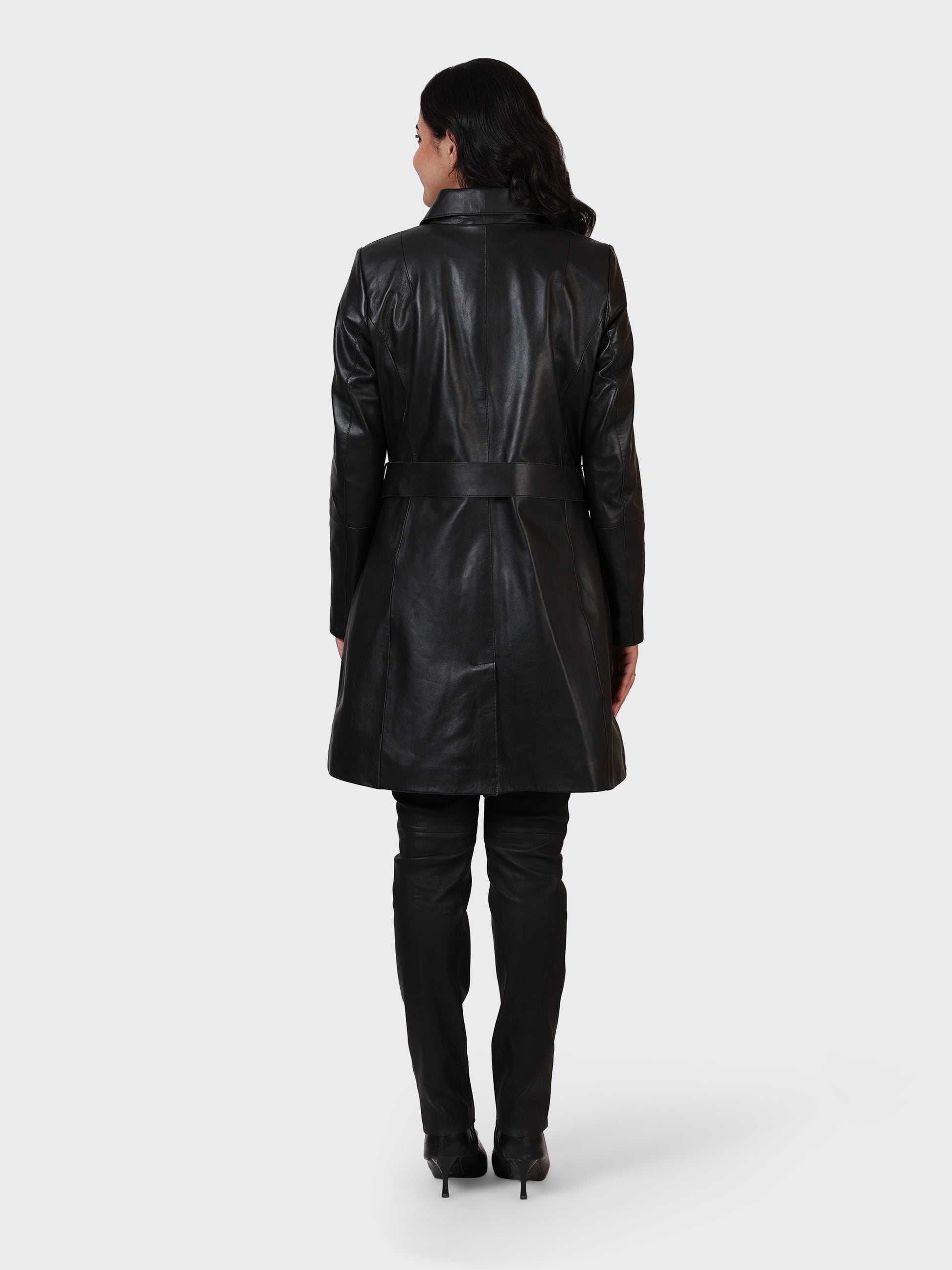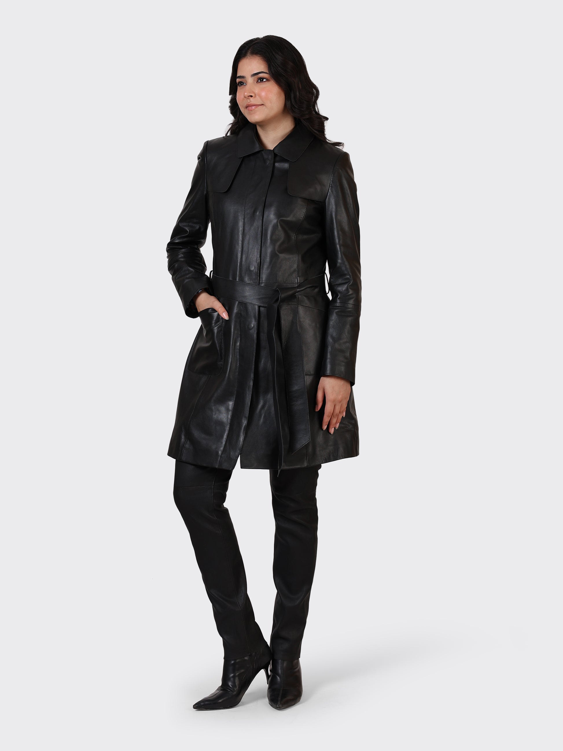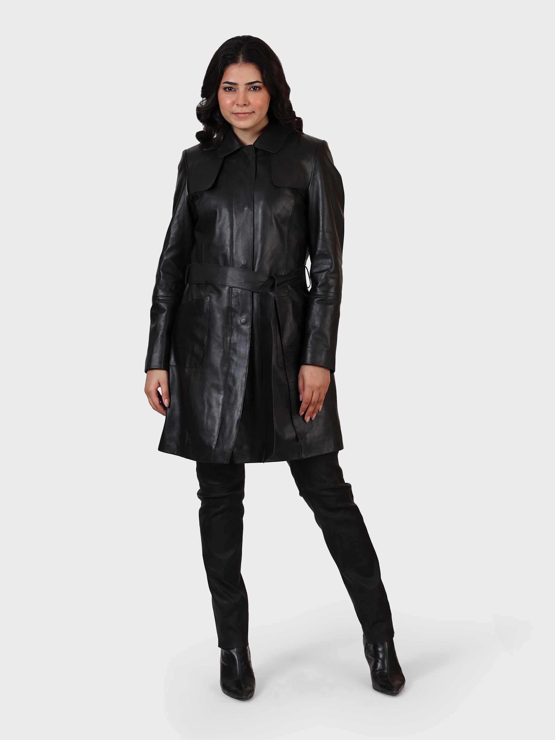 A chic and versatile ladies' knee-length leather jacket crafted from 100% genuine lamb leather. Designed for winter wear, this jacket provides warmth, coverage, and timeless elegance. It features two practical side pockets and is finished with a smooth polyester lining, ensuring comfort and durability for everyday use or evening outings.