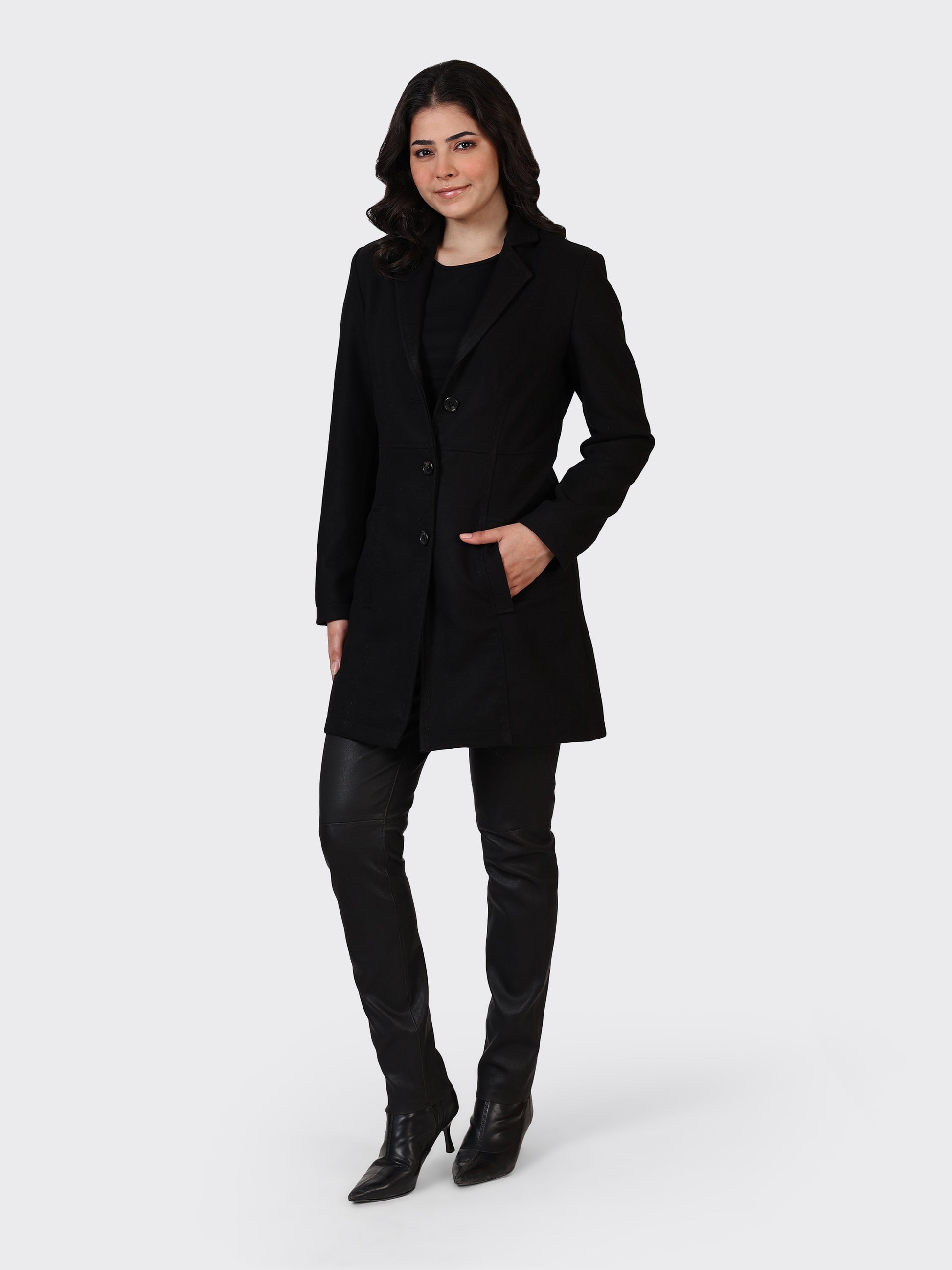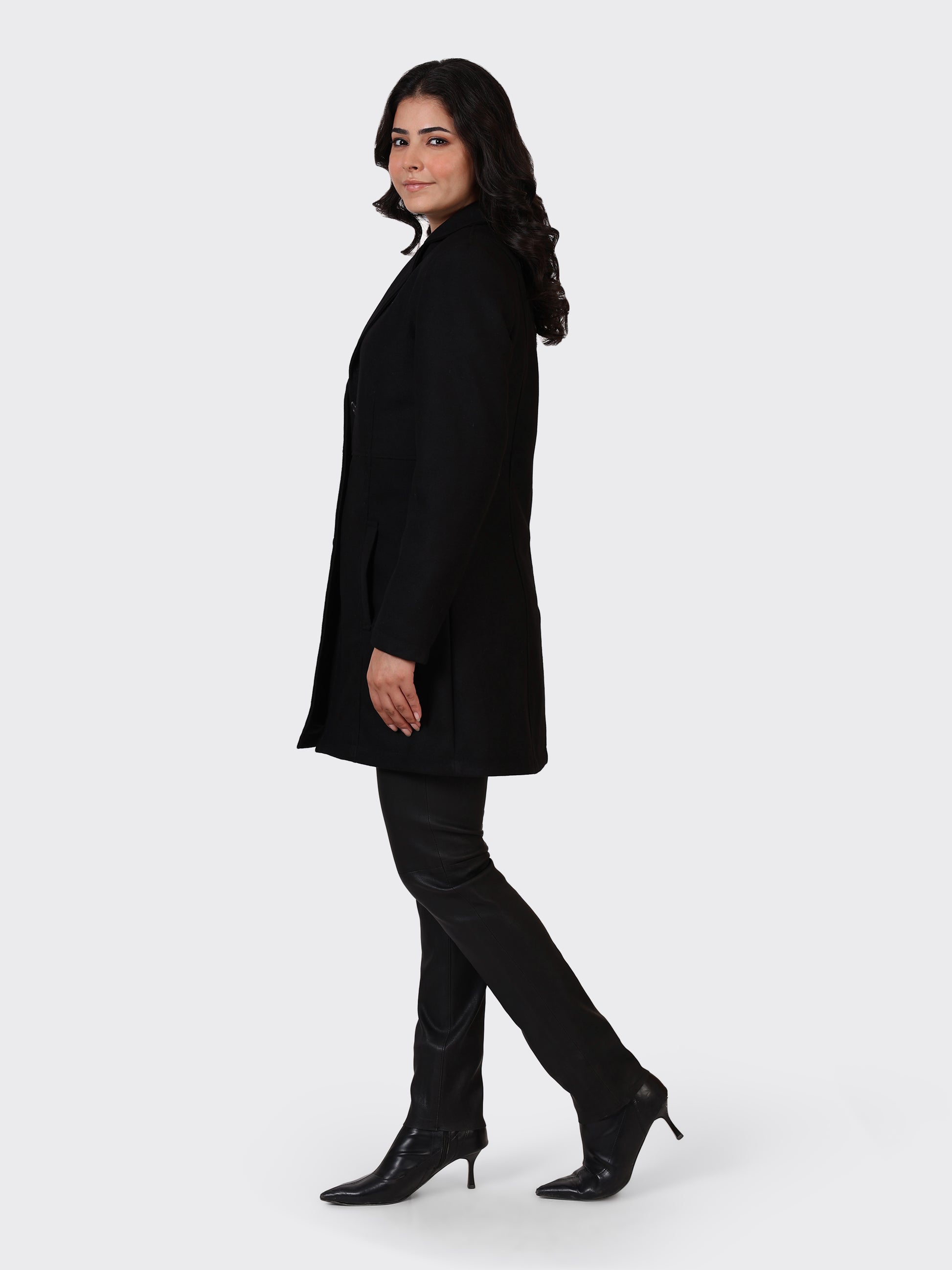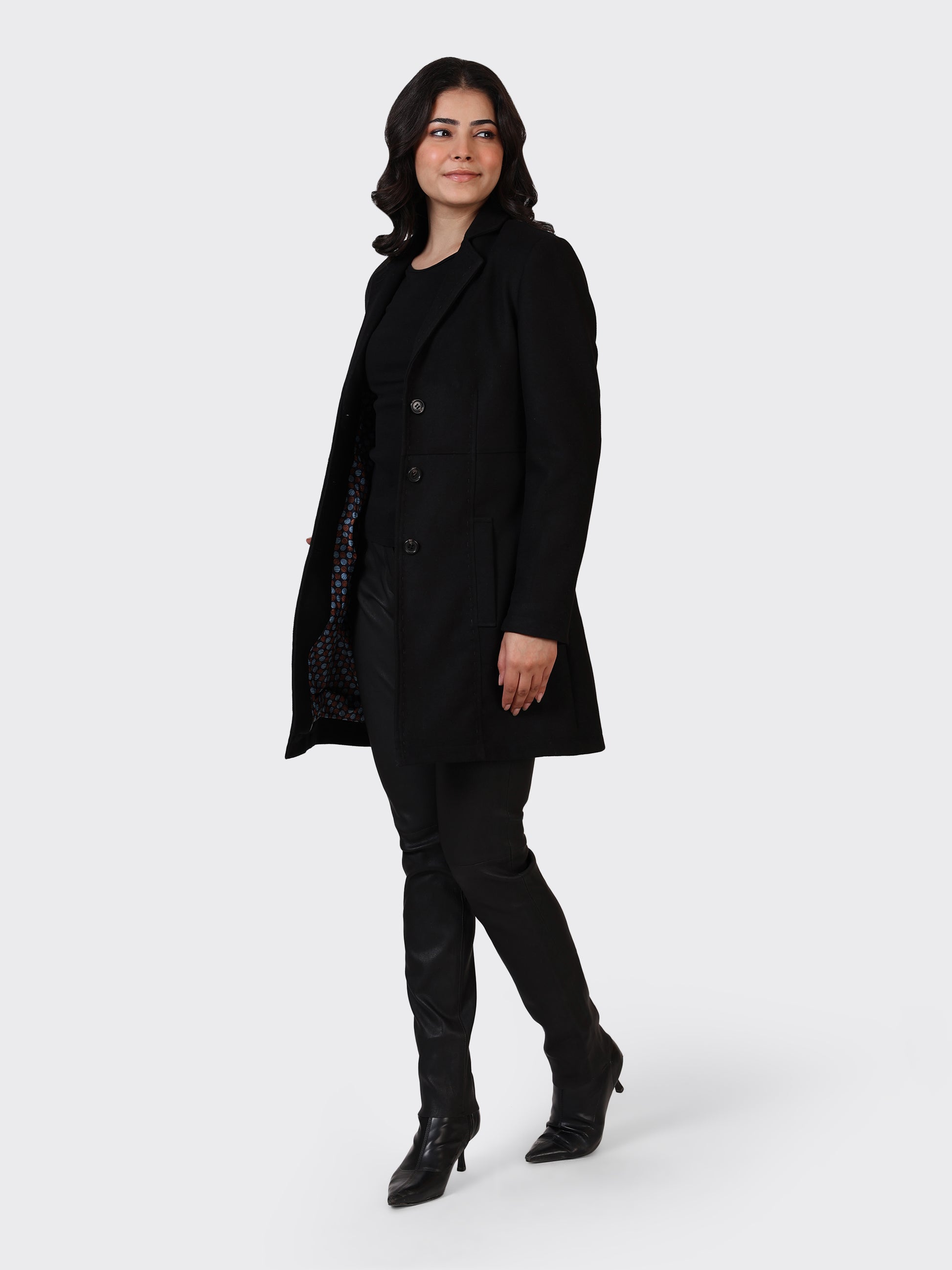 Ladies knee-length jacket crafted from 100% premium wool, designed for winter warmth and elegance. This jacket features a tailored fit with long sleeves, suitable for formal occasions or stylish casual wear. The soft polyester lining enhances comfort, while the high-quality wool fabric ensures durability and a refined finish. Dry cleaning is recommended to preserve the texture, shape, and deep black color of the jacket.
