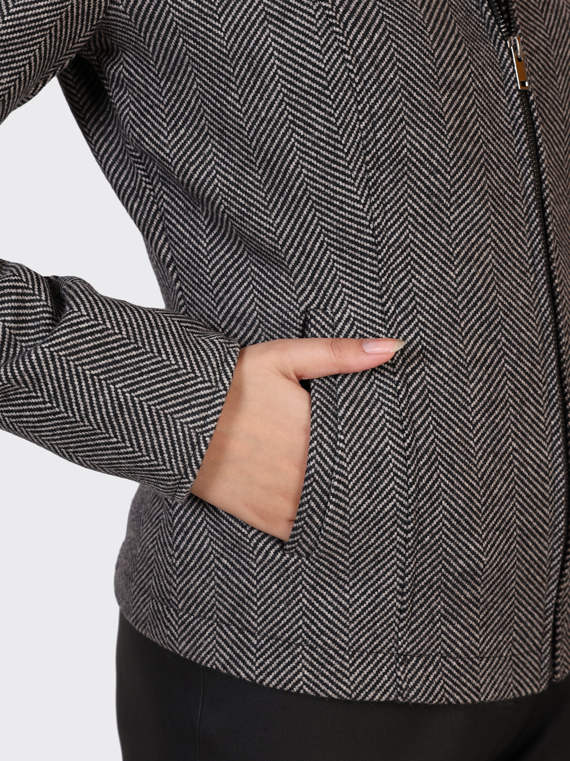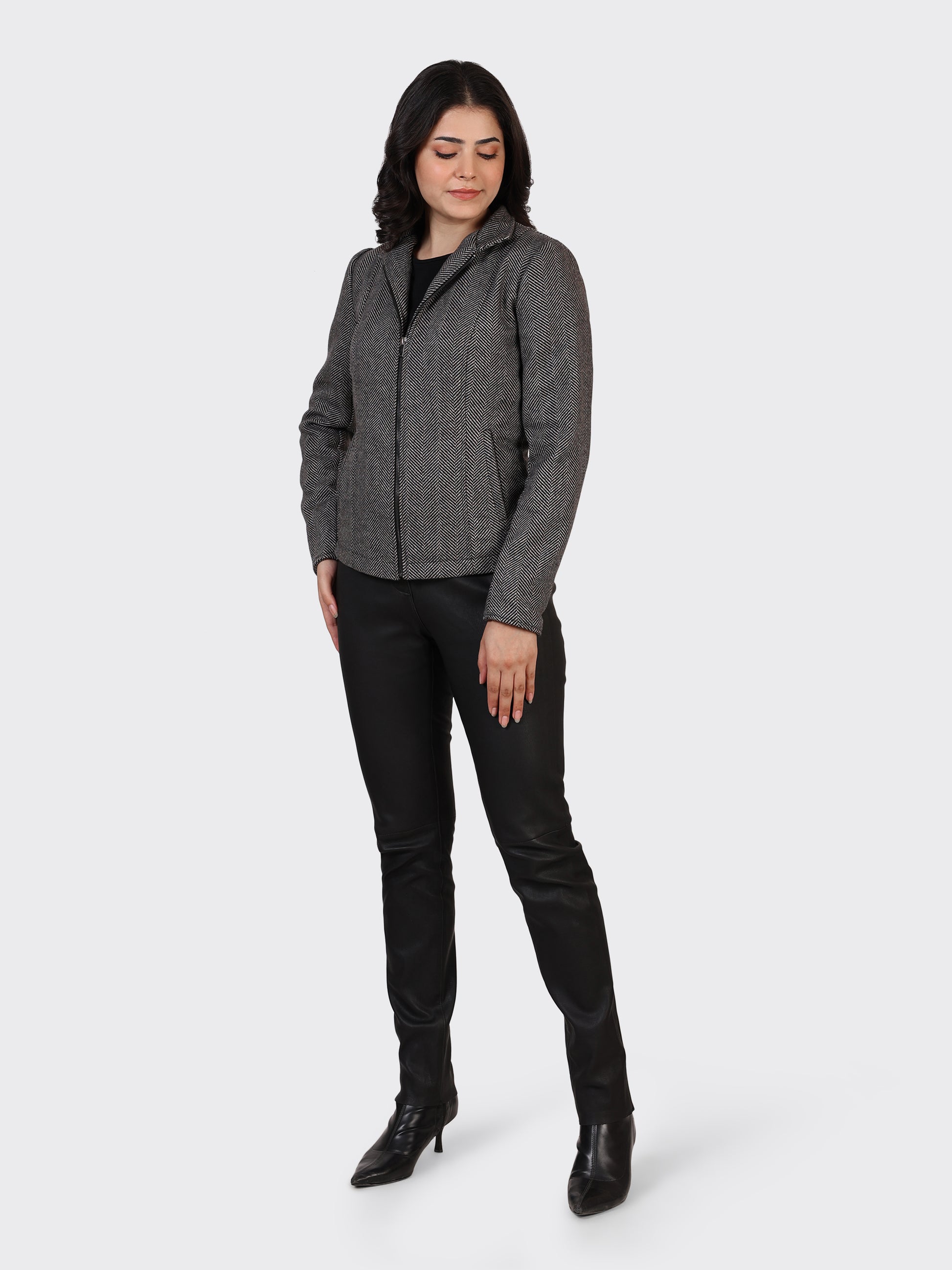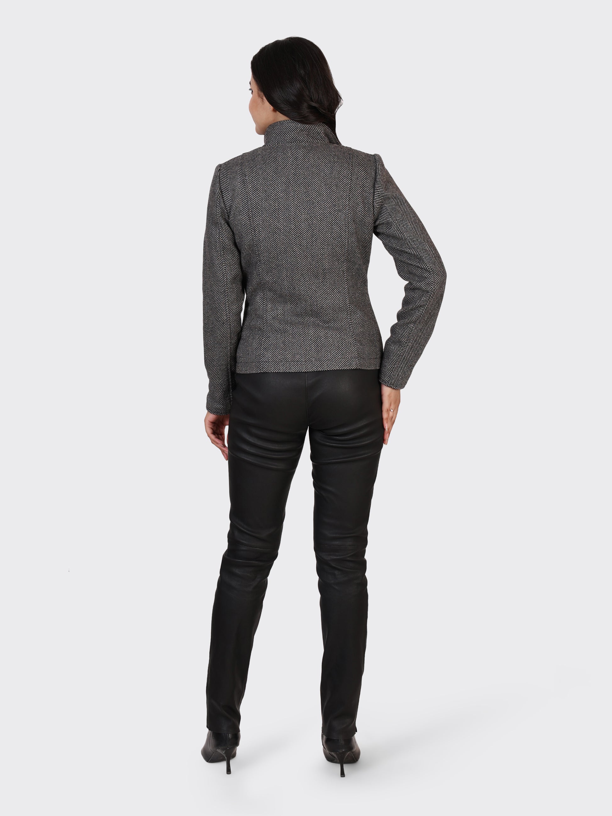 A stylish ladies' woollen jacket made from a blend of 40% wool and 20% polyester, perfect for winter wear. This jacket combines elegance and comfort, featuring long sleeves and a formal design suitable for both casual and professional settings. It is designed for easy care with dry cleaning recommended.