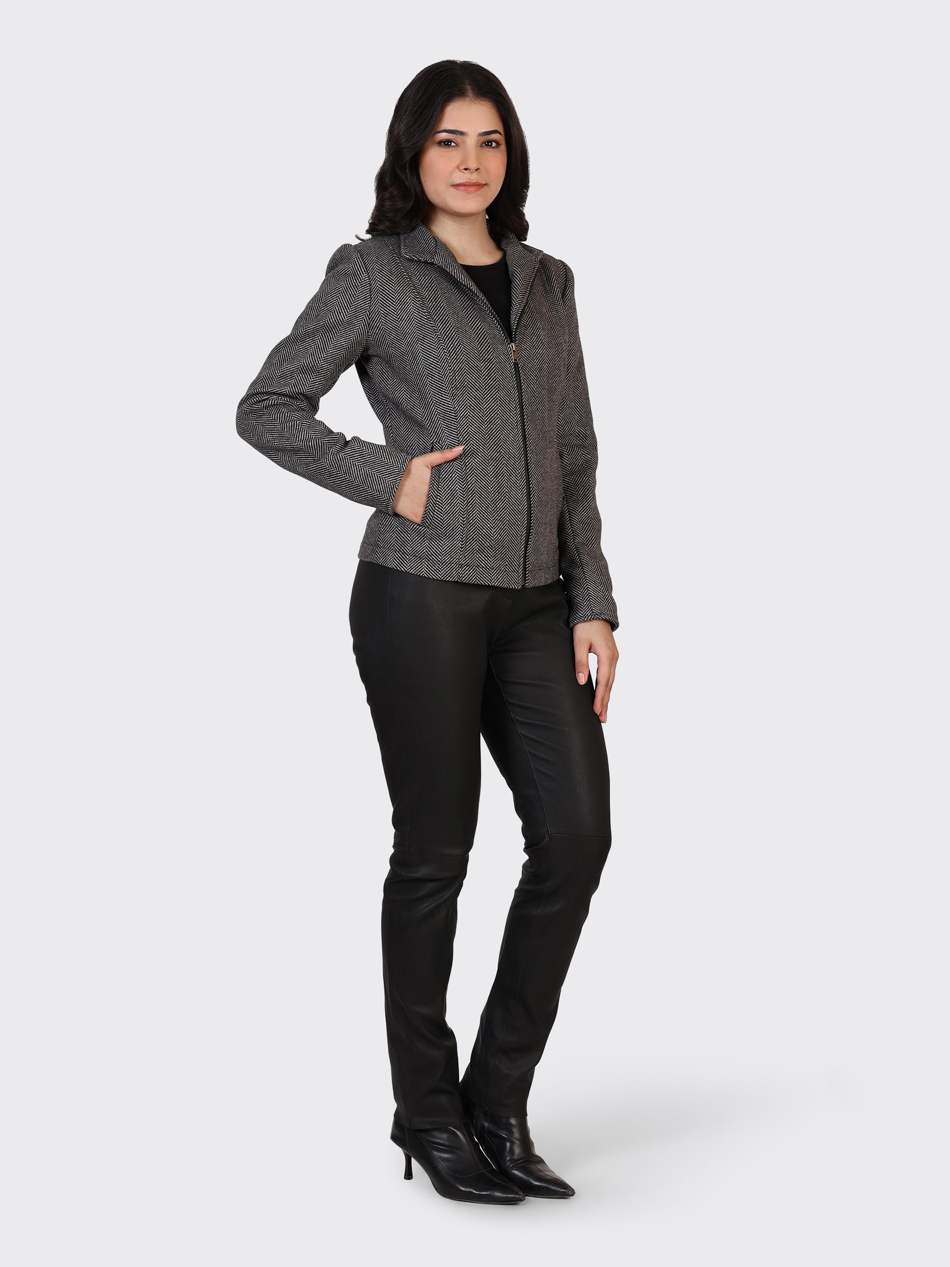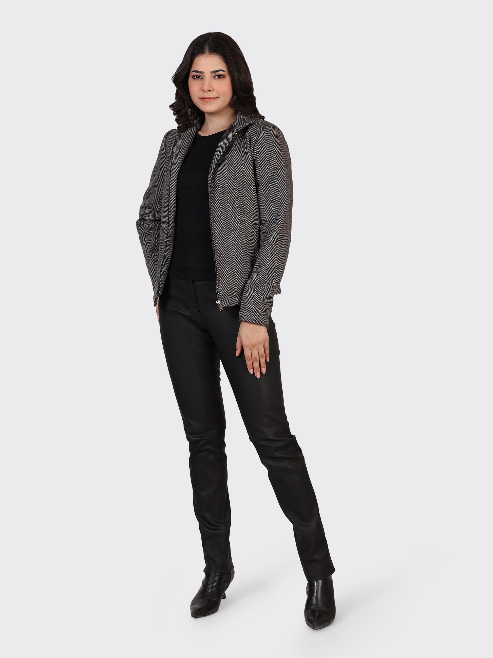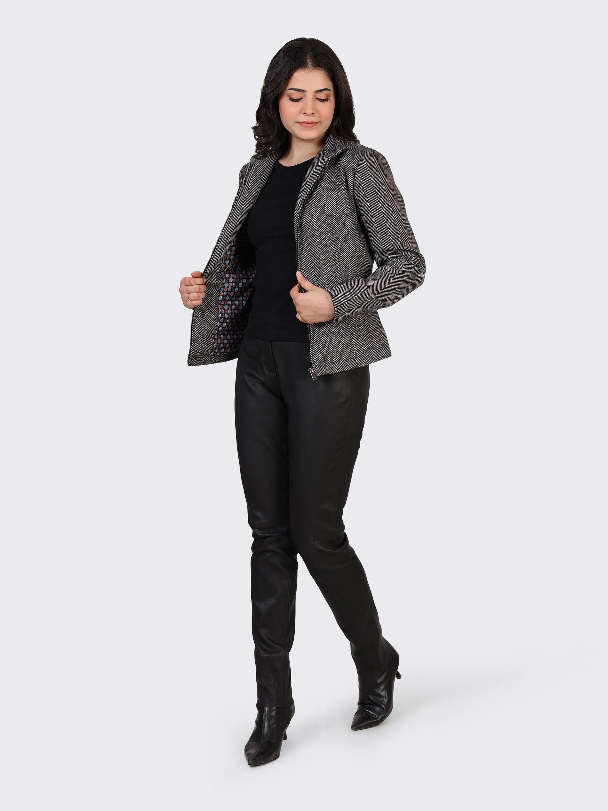 A stylish ladies' woollen jacket made from a blend of 40% wool and 20% polyester, perfect for winter wear. This jacket combines elegance and comfort, featuring long sleeves and a formal design suitable for both casual and professional settings. It is designed for easy care with dry cleaning recommended.