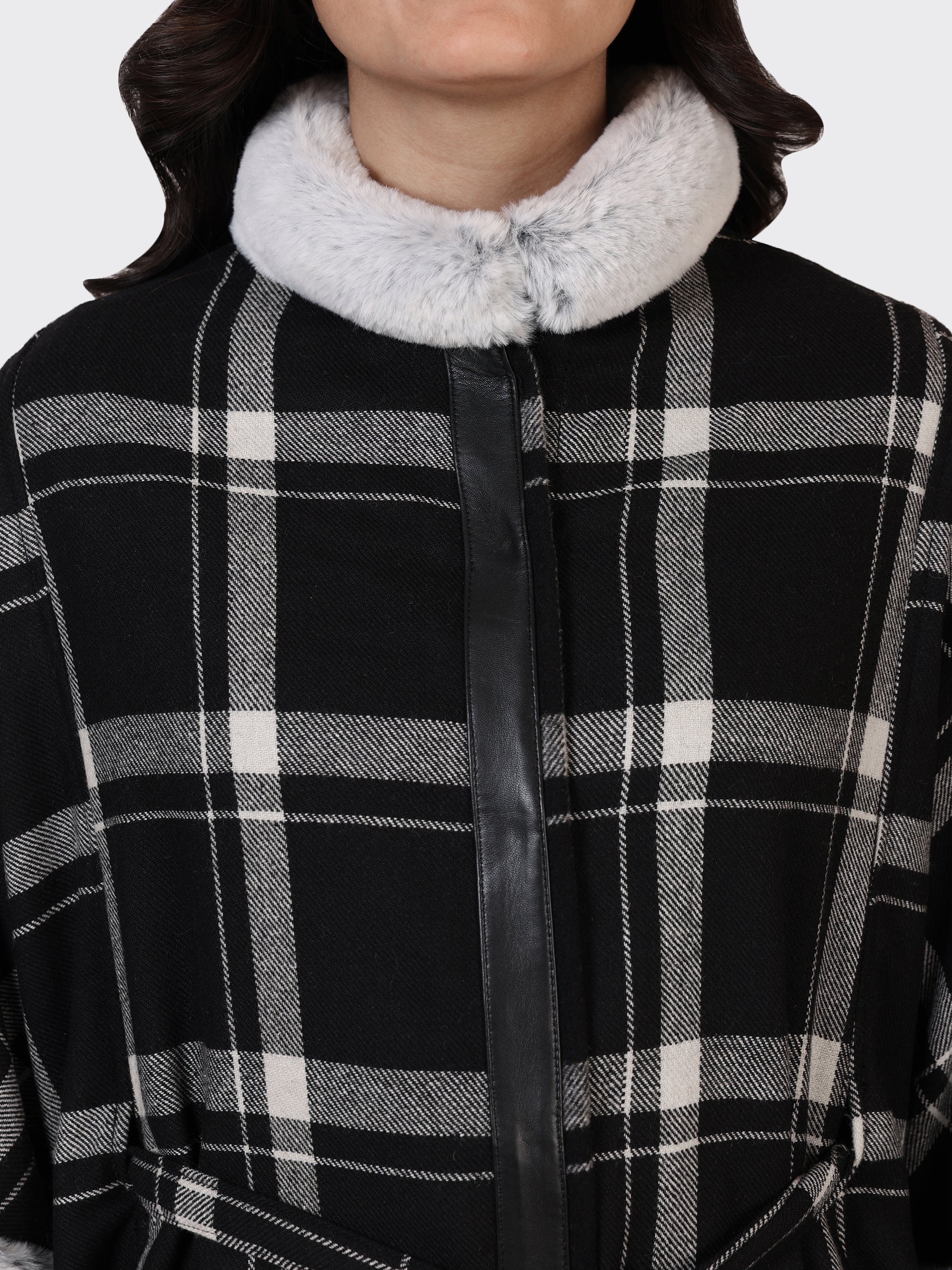 Ladies cape in a stylish multi-check pattern with faux fur trim, crafted from a blended fabric (20% wool, 80% polyester). This winter cape features a formal design with three-quarter sleeves and polyester lining for comfort. Dry cleaning recommended.