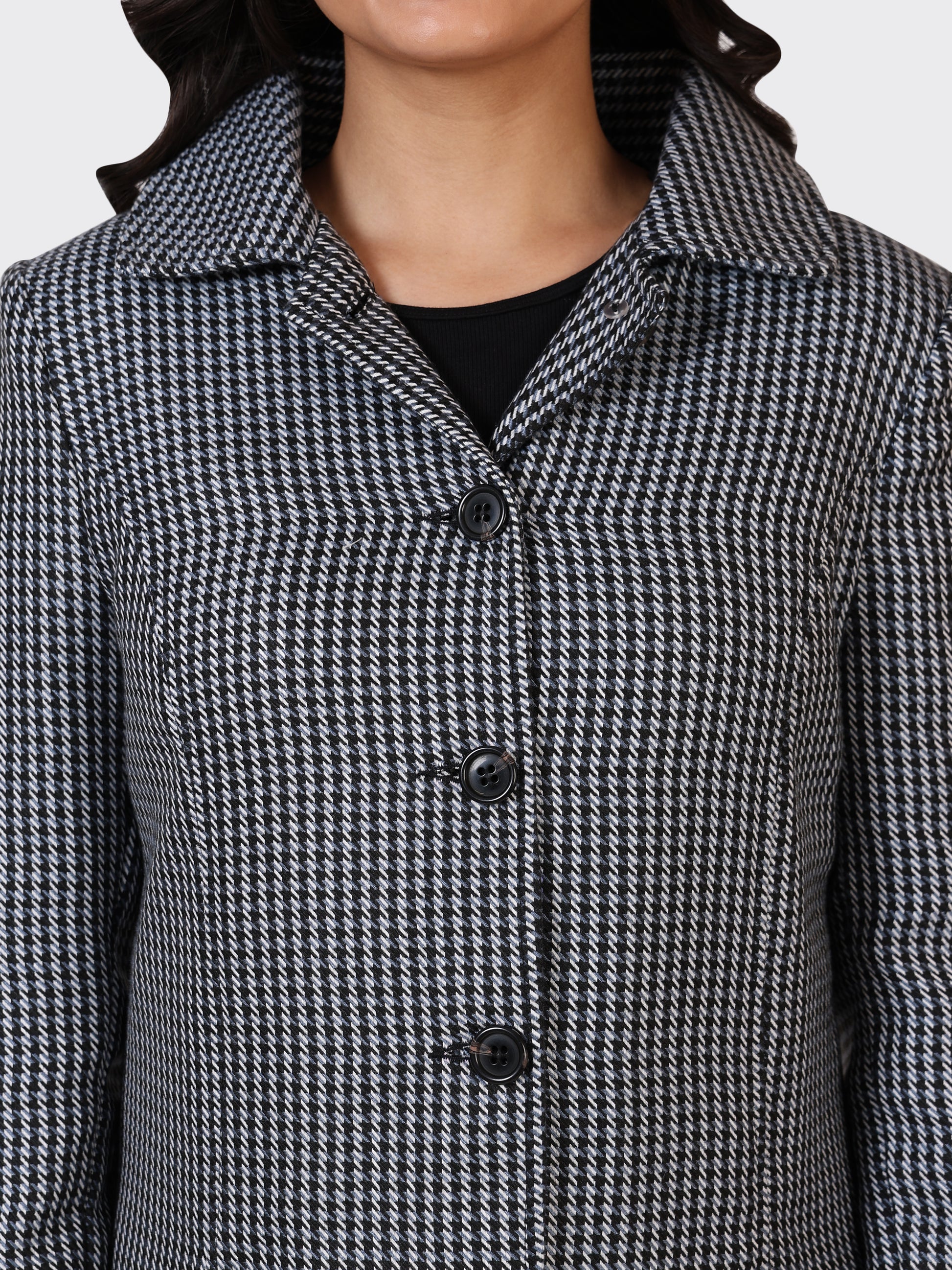 Ladies knee-length jacket made of 20% wool and 80% polyester, ideal for winter. Features long sleeves and a formal design. Dry cleaning recommended.