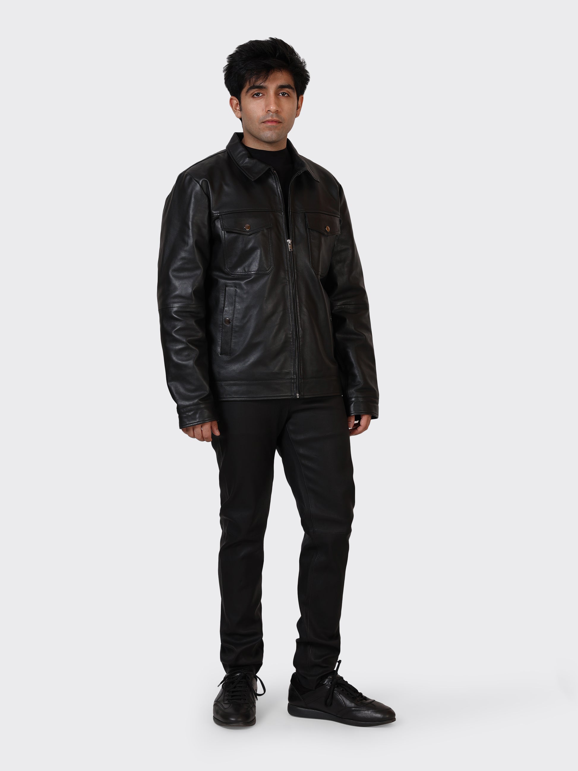 A stylish and versatile men's waist-length leather jacket crafted from 100% genuine lamb leather. Designed for winter wear, this jacket provides warmth and a premium finish. It features two practical side pockets and is lined with smooth polyester, ensuring comfort, durability, and a refined look for everyday use or evening outings.
