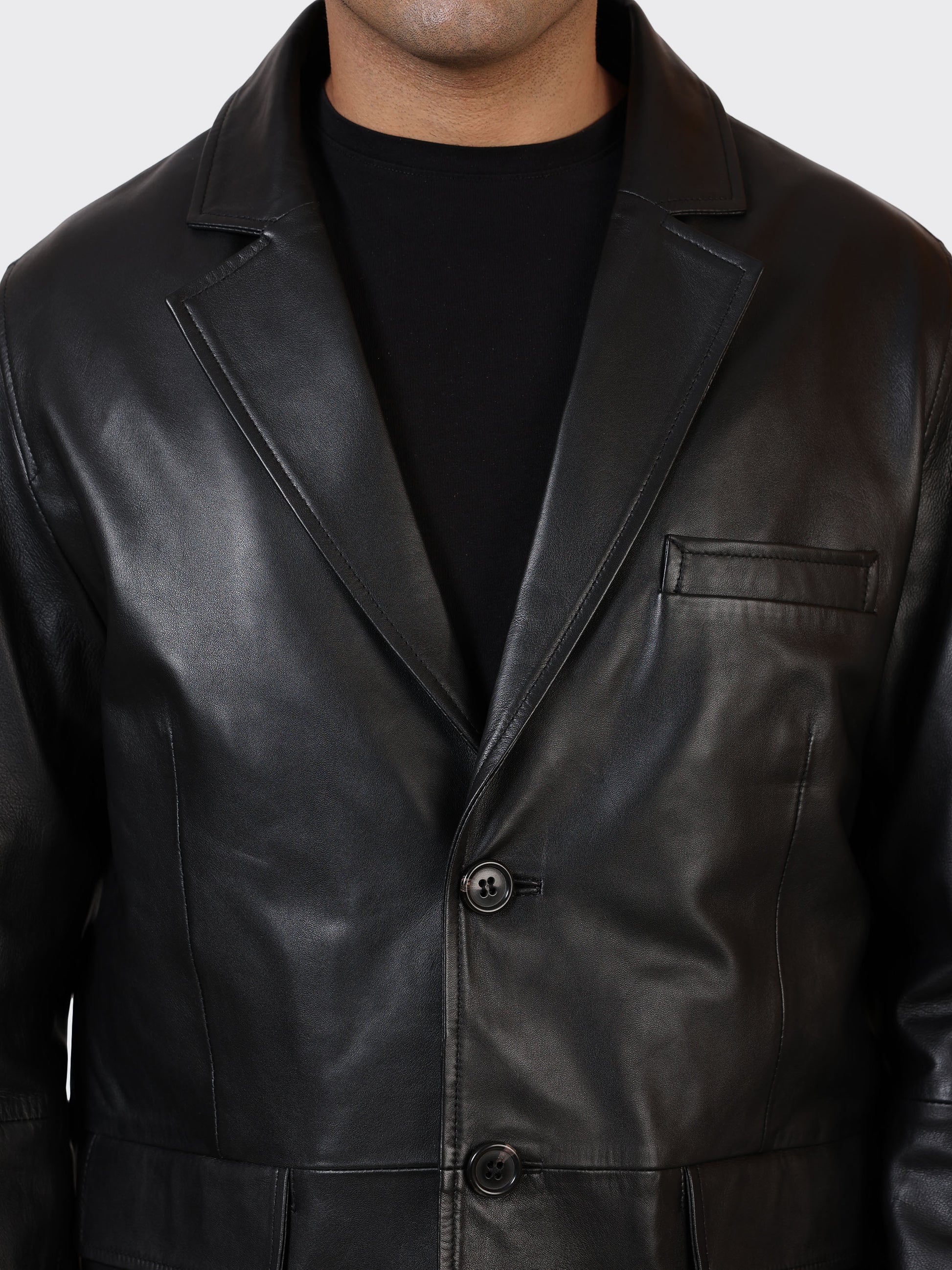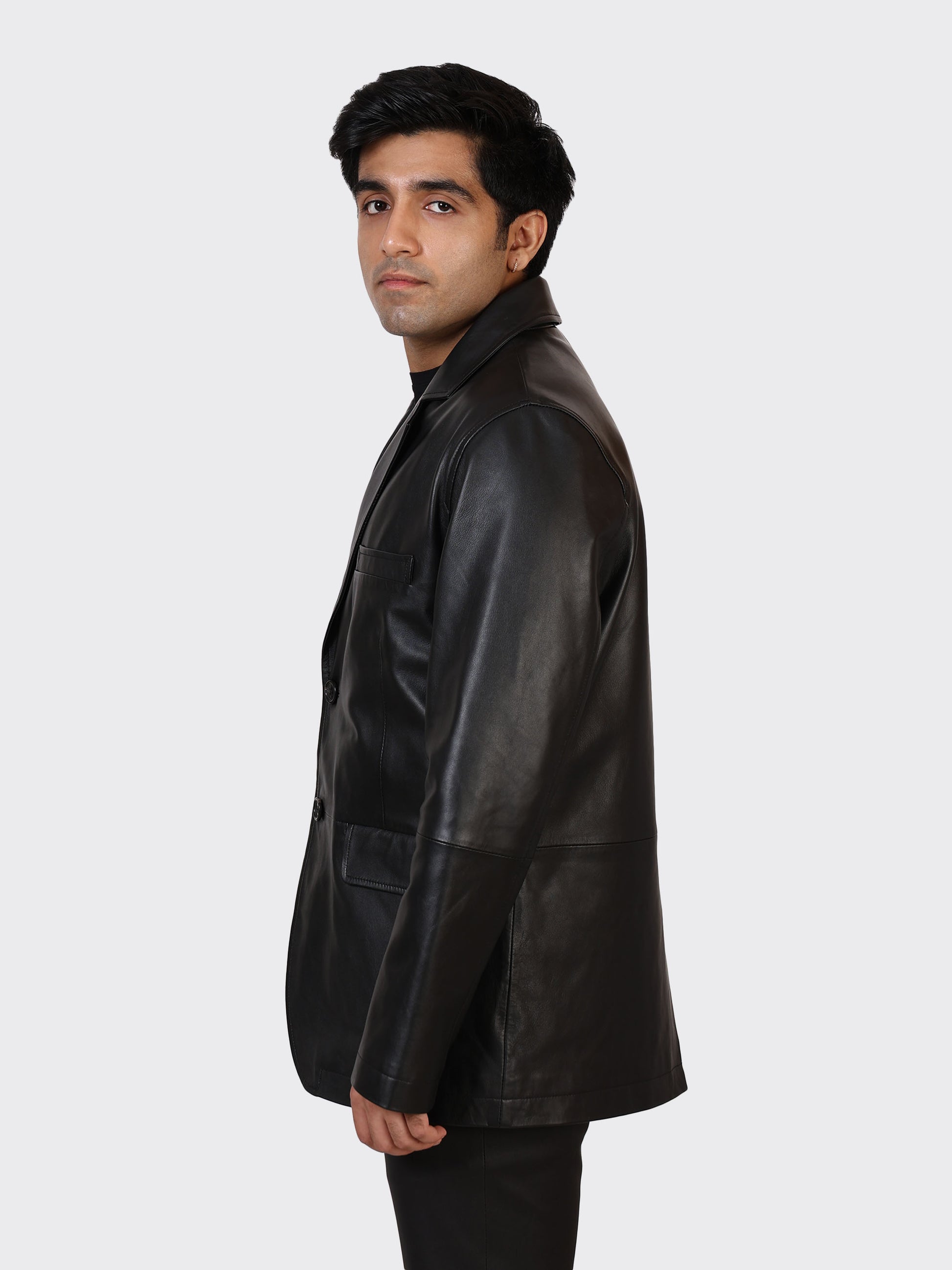 Premium men's leather blazer jacket in black, crafted from 100% genuine lamb leather. Designed for winter fashion, it combines style and durability. Features a polyester lining and requires specialized leather dry cleaning to maintain quality. Perfect for formal and semi-formal occasions.