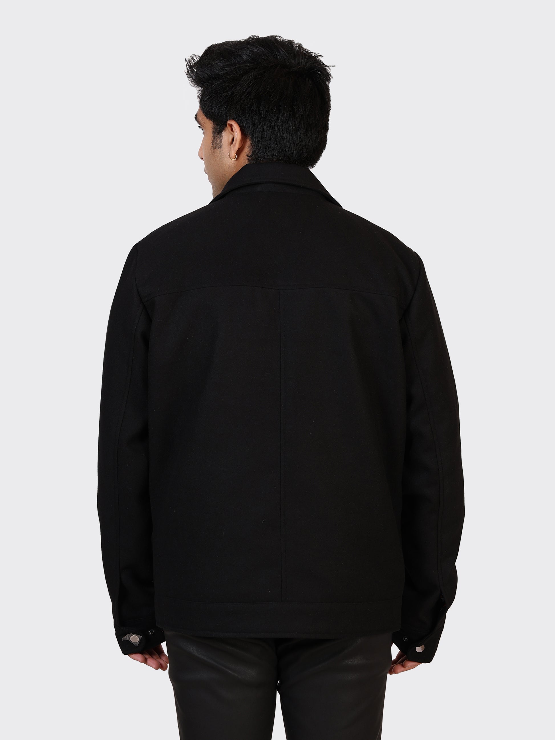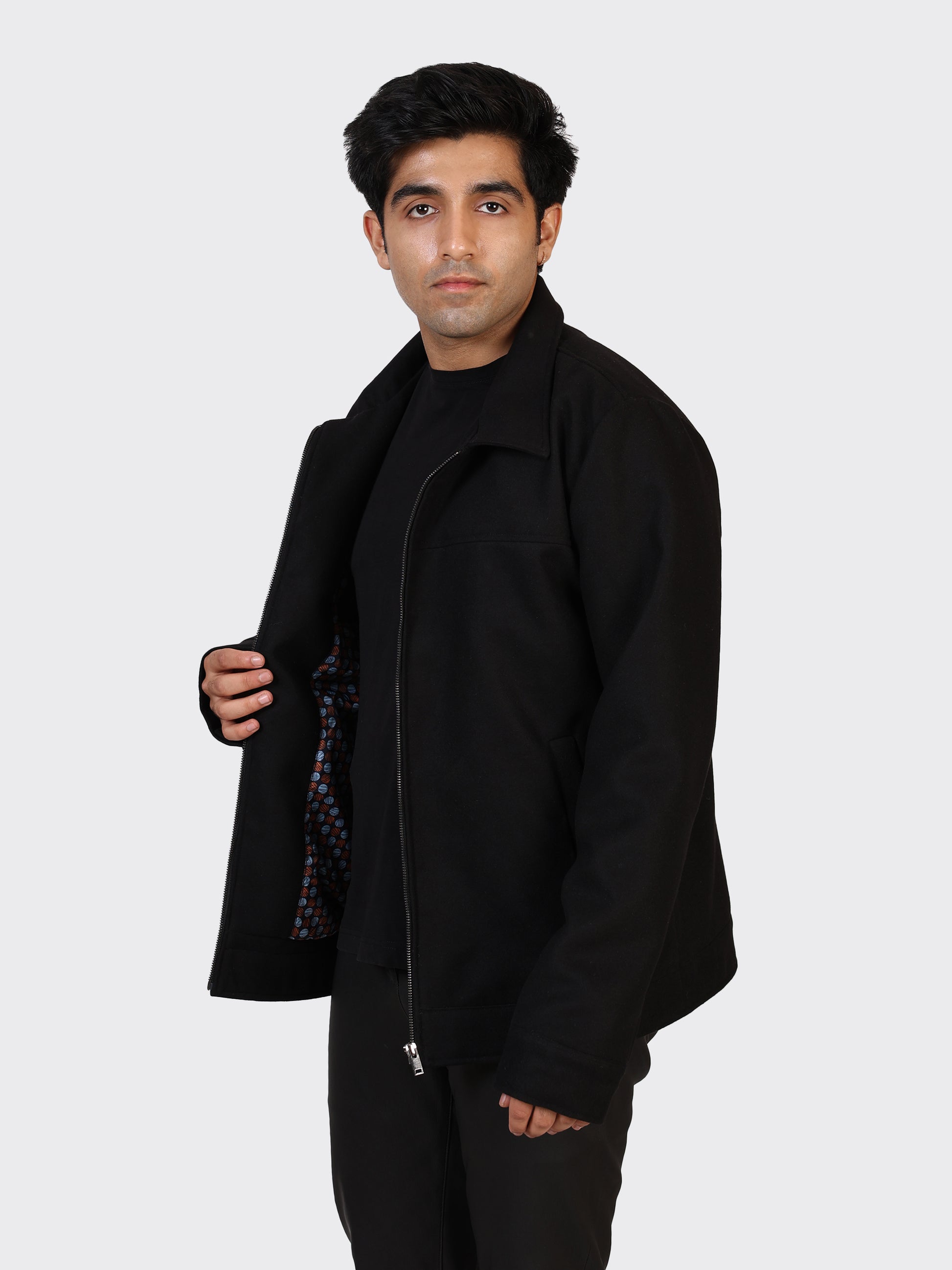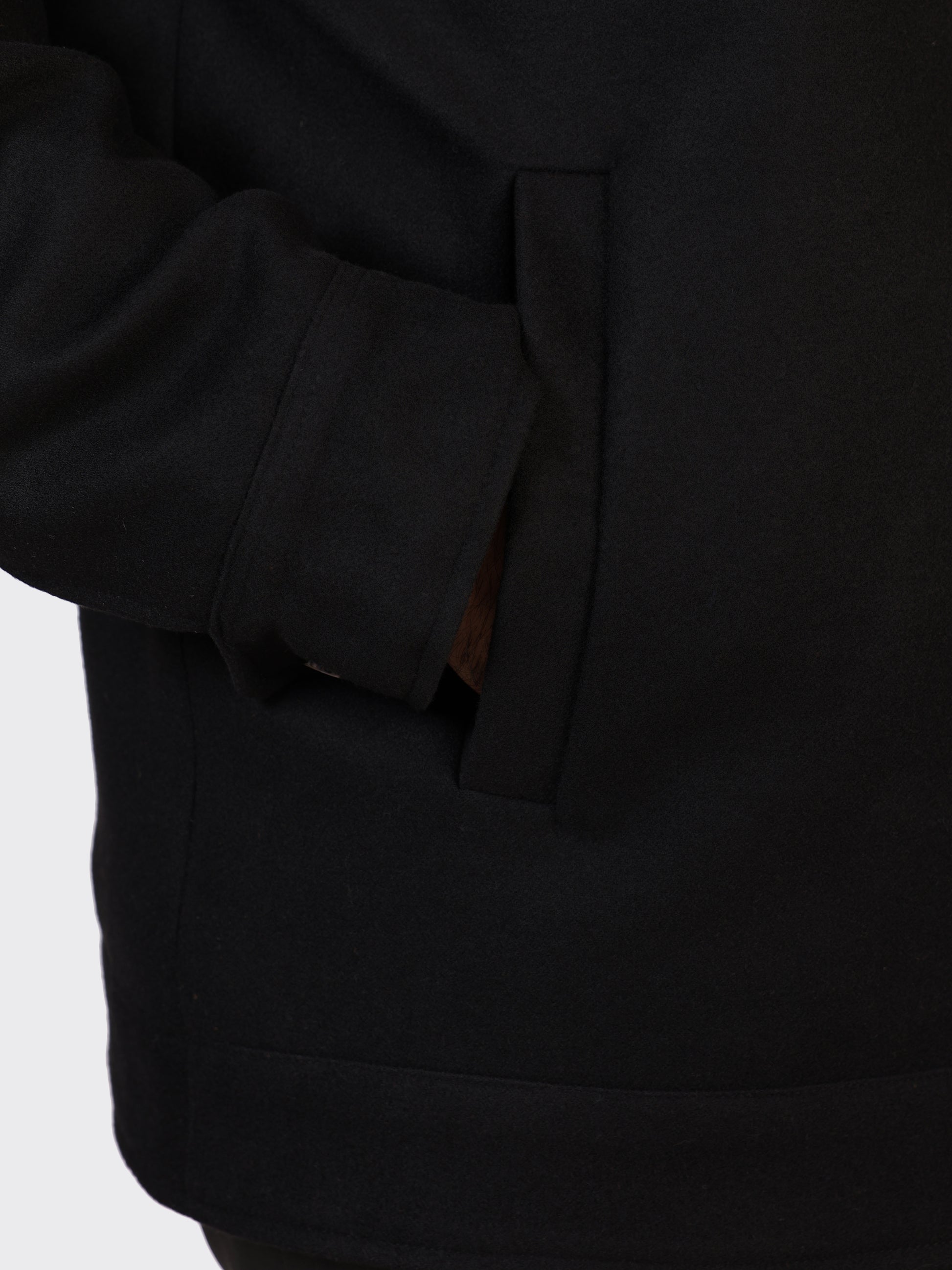 Mens waist-length jacket in 100% wool, designed for winter wear. Features long sleeves and formal style. Dry cleaning recommended.